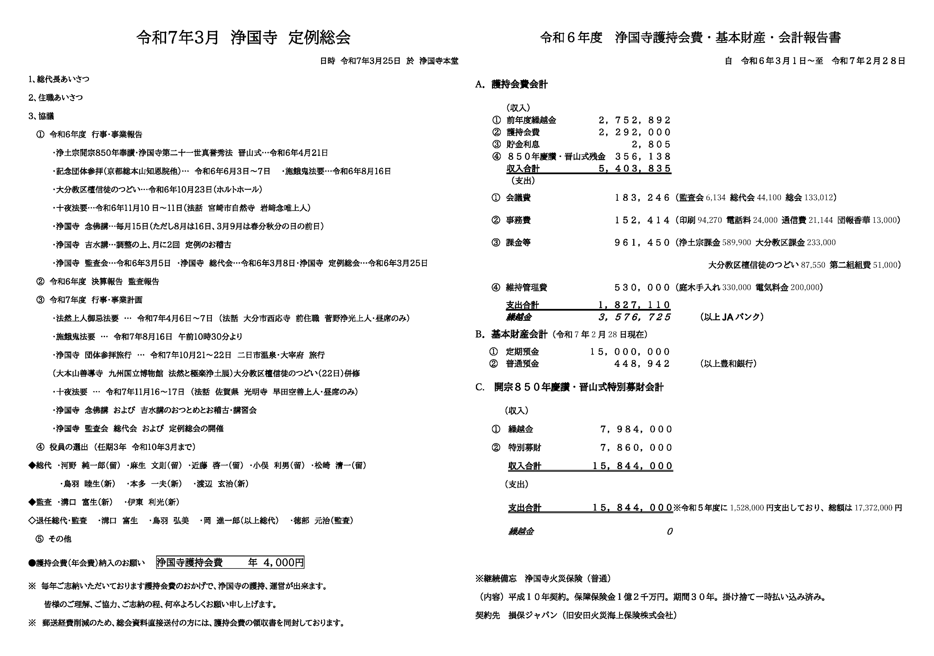 浄国寺では、年4,000円で護持会への入会を募集しています。お寺を護(・)り維持(・)をしていく会として、約600口のご入会をいただいています。年2回の法要の案内、会計報告、浄土宗カレンダーの配布、その他団体参拝旅行等のご案内をいたします。